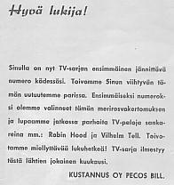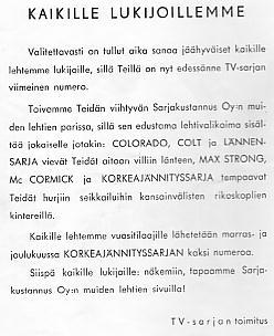 Kustannus Oy Pecos Bill Tampereelta alkoi julkaista TV-sarjaa vuonna 1961. Ensimmäisenä vuonna lehti ilmestyi 9 kertaa. Vuonna 1962 lehdestä ilmestyi 12 numeroa eli lehti kerran kuussa. Numerosta 12 alkaen kustantajana oli Sarjakustannus Oy vastaavan toimittajan ollessa kuitenkin entinen. Lehti ilmestyi vielä vuonna 1963, jolloin numero 10 oli lehden viimeinen. Lehteä ilmestyi siten vajaan kolmen vuoden aikana 31 kpl. Vuositilaajat saivat kesken vuotta lopetetun lehden tilalle Korkeajännityssarjan numeroita.