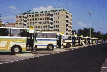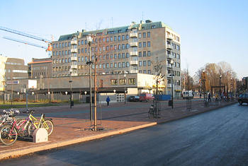 Joensuun keskusaukio toimi pitkään paikallisliikenteen tulo- ja lähtöalueena. Linja-autot häädettiin alueelta kun Siltakatu muutettiin joukkoliikennekaduksi ja pysäkit siirrettiin pois keskusaukiolta. Aukion halki kulkee Sininen virta. Kuvapari osoittaa, että kaupunkikuvan muutoksiin vaikuttaa myös katurakentaminen. Kuvat vuosilta 1991 ja 2005. |