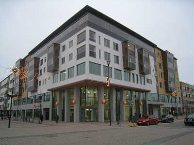 Kauppakadun ja Koskikadun kulma vuosina 2012 ja 2015. Tontilla ollut entinen Oma-Avun myymälärakennus purettiin vuonna 2013. Tilalle nousi vuosina 2014 - 2015 Osuuspankin toimitilat käsittävä uudisrakennus. Pankkitoiminta rakennuksessa alkoi vuoden 2016 tammikuussa.