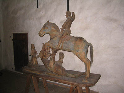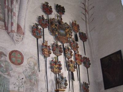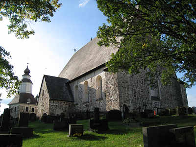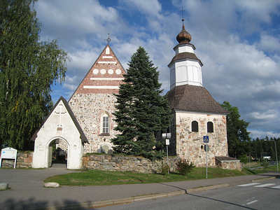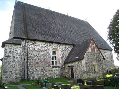 Kirkon tapulin kivinen pohjakerros on keskiajan lopulta ja yläosa vuodelta 1770.