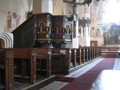 Sisätila on jaettu kymmenellä kahdeksankulmaisella pilarilla kolmeen korkeaan laivaan. Sivulaivoissa on ristiholvit. Keskilaivan holvit ovat kahden itäisimmän osalta 40-jakoisia, muut neljä 12-jakoisia tähti-holveja. Runkohuoneen seinien koristelu koostuu pääasiassa credo-sarjasta. Seinien ja holvien maalaukset ovat tyyliltään yhtenäisiä ja kuuluvat Taivassalon ryhmän piiriin. Alttarin pohjoispuolella on niin sanottu piispanpenkki. Loistavaksi työksi perustellusti luonnehdittu triumfikrusifiksi on veistetty 1480- tai 1490-luvulla. Vuonna 1648 on lahjoitettu vaikuttava alttarilaite, joka on edelleen paikallaan. Saarnatuoli on lahjoitettu vuonna 1651. Kirkon sisustukseen kuuluu Suomen oloissa rikas kokoelma keskiajan ja uuden ajan alkupuolen harvinaisia ja korkeatasoisia töitä, joiden joukossa on loistava kokoelma 1600-luvun hautausvaakunoita. Yrjänä-ryhmä alttarin pohjoispuolella on vuoden 1500 tienoilta.