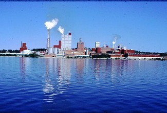 Rukaveden oikealla rannalla näkyy StoraEnson Enocellin Uimaharjun selluloosatehdas ja saha.
